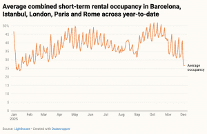 When averaging occupancy across the five cities and plotting it over 2025, the shift becomes clear. The traditional peak months of July and August were noticeably softer than May–June and September–October.