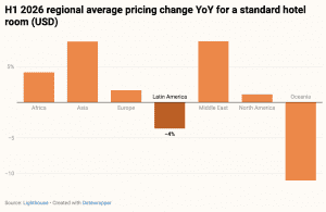 There is a 20-percentage-point gap between the strongest and weakest regions. Asia and the Middle East are seeing average hotel prices up 9% for H1 2026, while Oceania shows an 11% decline compared with the first half of 2025.